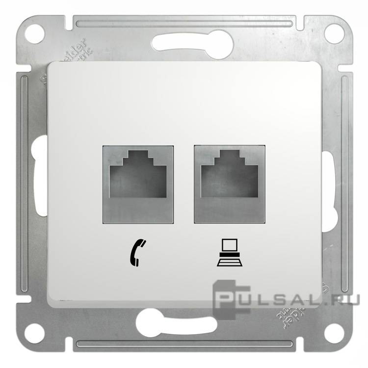 Розетка телефонная RJ11 + компьютерная RJ45 Cat.5e (UTP) Glossa, двойная, цвет - белый