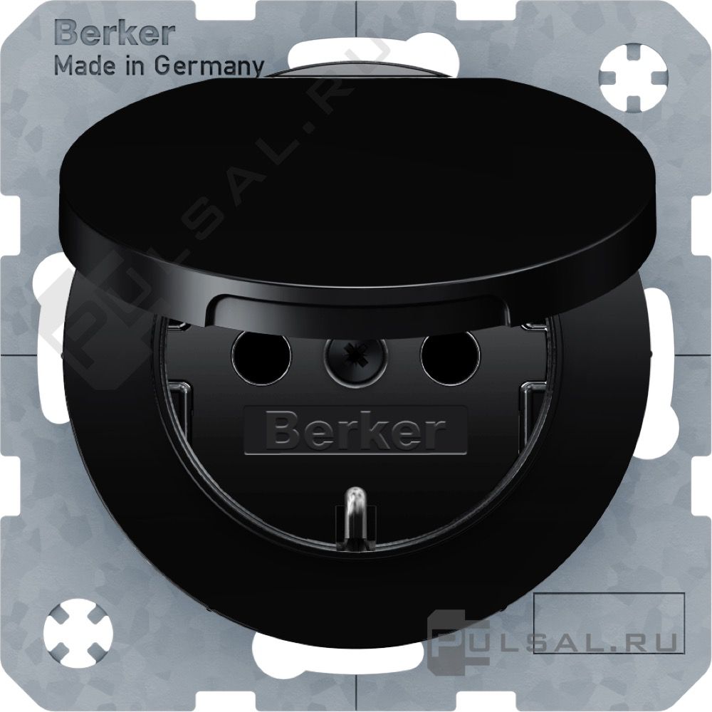 Розетка R.1, R.3, R.8, со шторками, с крышкой, с заземлением, одинарная, безвинтовые клеммы, цвет - черный глянцевый