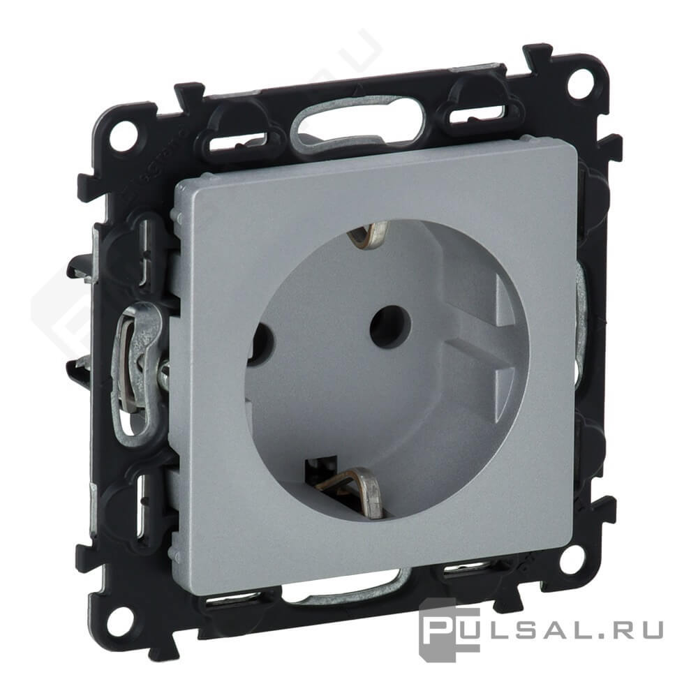 Розетка Valena Life, со шторками, с заземлением, одинарная, безвинтовые клеммы, цвет - алюминий