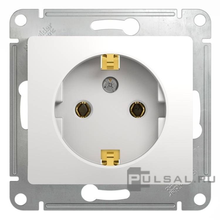 Розетка Glossa, без шторок, с заземлением, одинарная, винтовые клеммы, цвет - белый