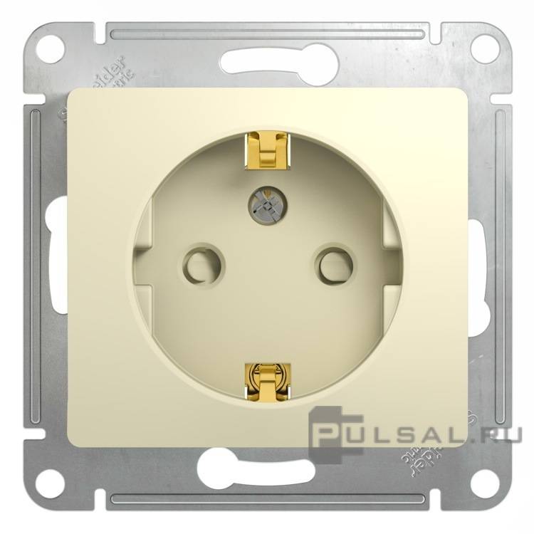 Розетка Glossa, со шторками, с заземлением, одинарная, винтовые клеммы, цвет - бежевый