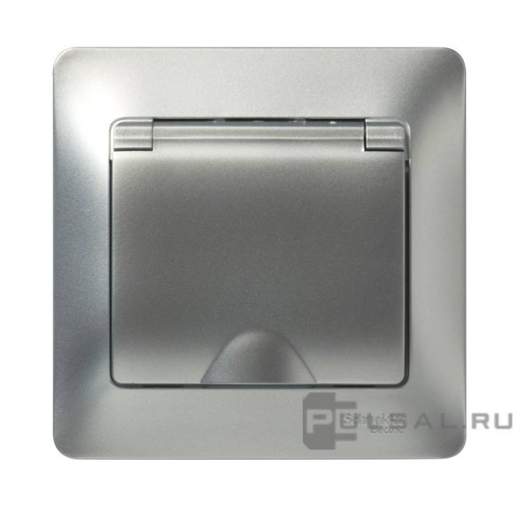 Розетка с рамкой Glossa, со шторками, с крышкой, с заземлением, одинарная, винтовые клеммы, цвет - алюминий