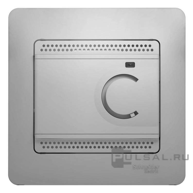 Терморегулятор 10А, НО-контакт, 230В Glossa, поворотный, датчик t° пола (внешний), без таймера, цвет - алюминий