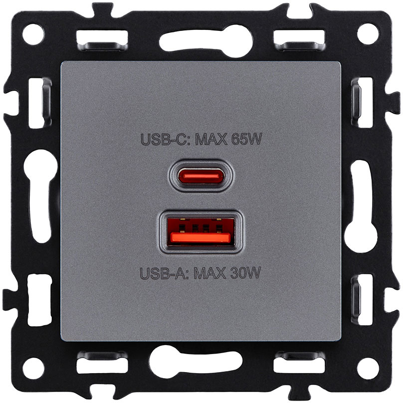Розетка USB type-C + type-A, 3.0А 65Вт Asthetik, USB type-C 5V, USB type-A 5V, двойная, цвет - серый