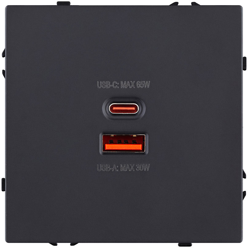 Розетка USB type-C + type-A, 3.0А 65Вт Eclipse, USB type-C 5V, USB type-A 5V, двойная, цвет - черный матовый