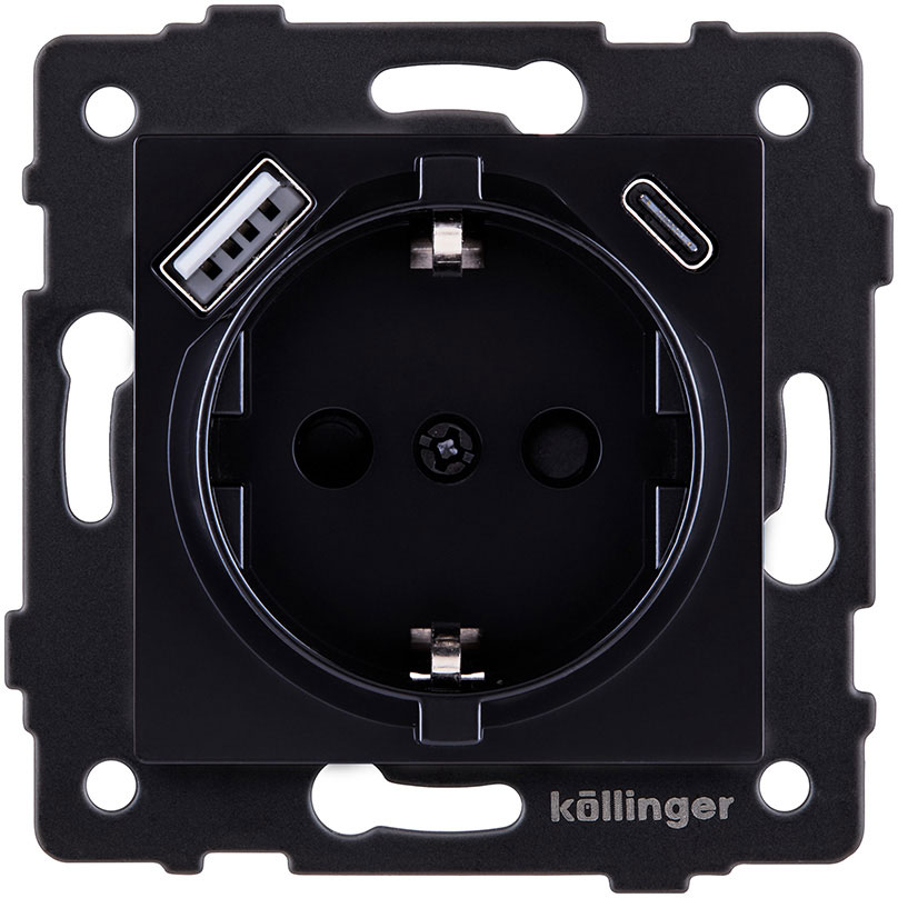 Розетка USB A+C 2.4А с электрической розеткой Aspekt, Eleganz, Reflex, USB type-C 5V, USB type-A 5V, двойная, цвет - черный