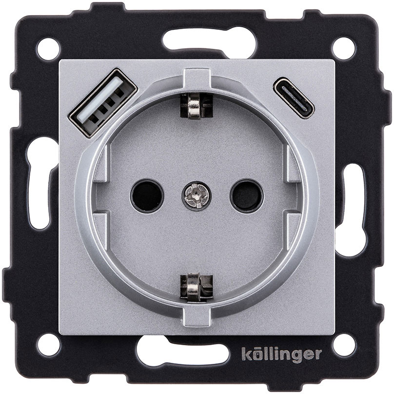 Розетка USB A+C 2.4А с электрической розеткой Aspekt, Eleganz, Reflex, USB type-C 5V, USB type-A 5V, двойная, цвет - серый