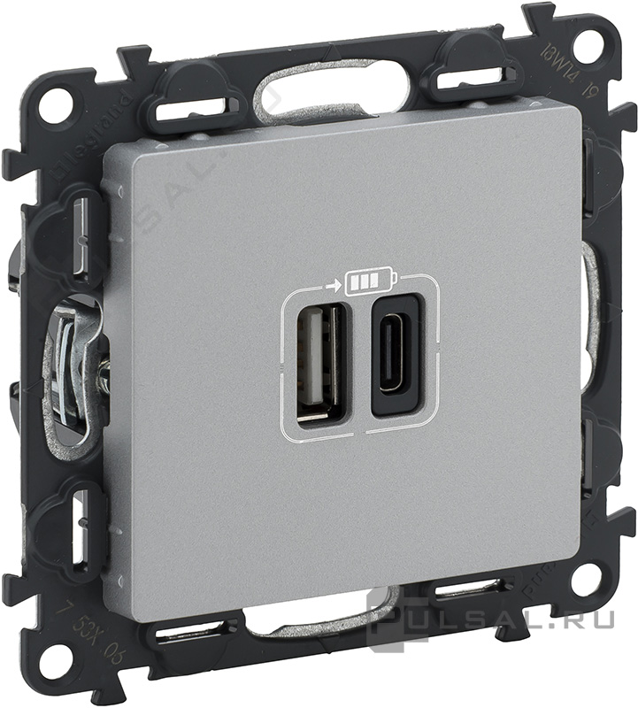 Розетка USB type-C + type-A, 3.0А Valena Life, USB type-C 5V, USB type-A 5V, двойная, цвет - алюминий