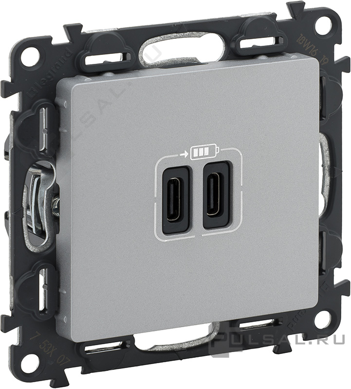 Розетка USB type-C, 3.0А Valena Life, USB type-C 5V, двойная, цвет - алюминий