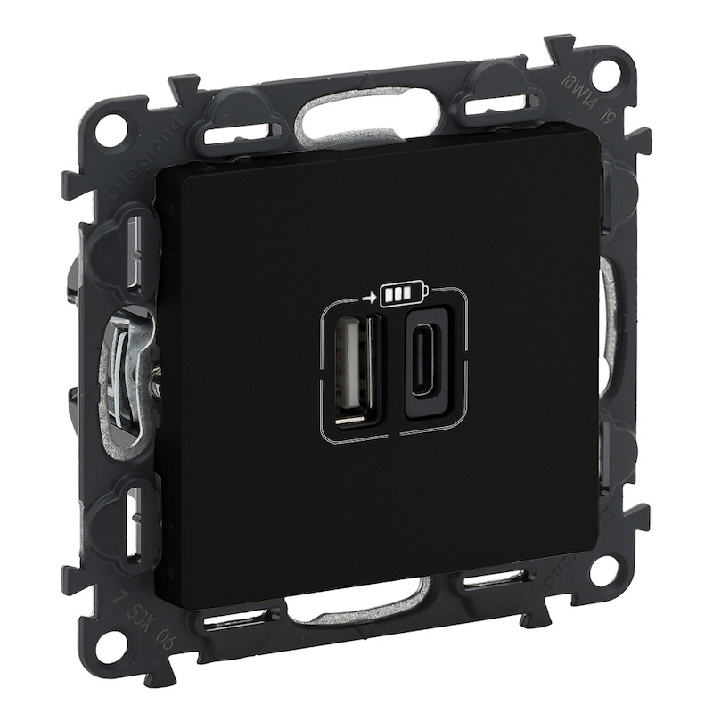 Розетка USB type-C + type-A, 3.0А Valena Life, USB type-C 5V, USB type-A 5V, двойная, цвет - матовый черный