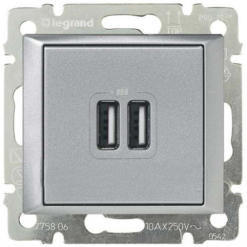Розетка USB, 1.5А Inspiria, Valena, Mosaic, USB type-A 5V, двойная, цвет - алюминий