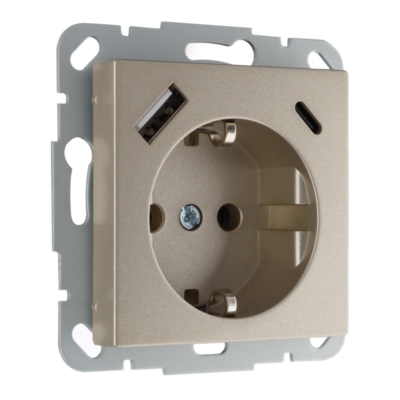 Розетка USB A+C, 3.4А с электрической розеткой Epsilon, Retro Liregus, USB type-C 5V, USB type-A 5V, двойная, цвет - шампань