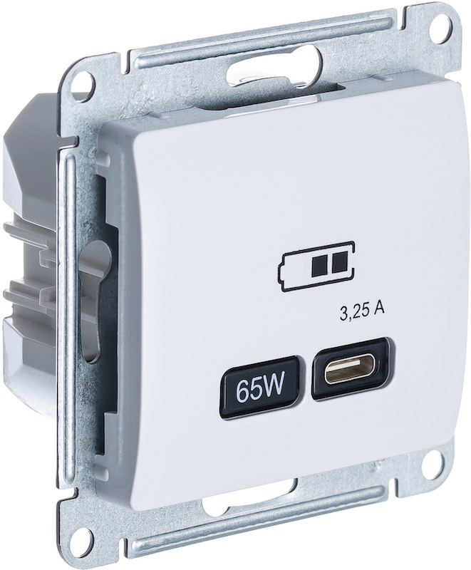 Розетка USB type-C 65 Вт с быстрой зарядкой Glossa, USB type-C 5V, одинарная, цвет - белый