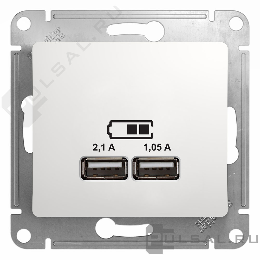 Розетка USB type-A, 2.1А Glossa, USB type-A 5V, двойная, цвет - белый