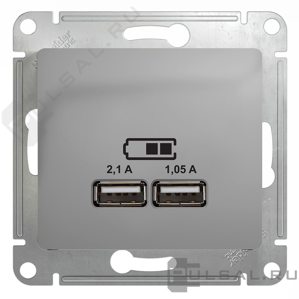 Розетка USB type-A, 2.1А Glossa, USB type-A 5V, двойная, цвет - алюминий