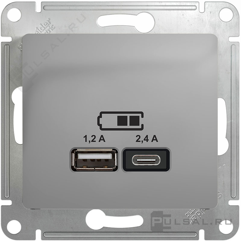 Розетка USB type-C + type-A, 2.4А Glossa, USB type-C 5V, USB type-A 5V, двойная, цвет - алюминий